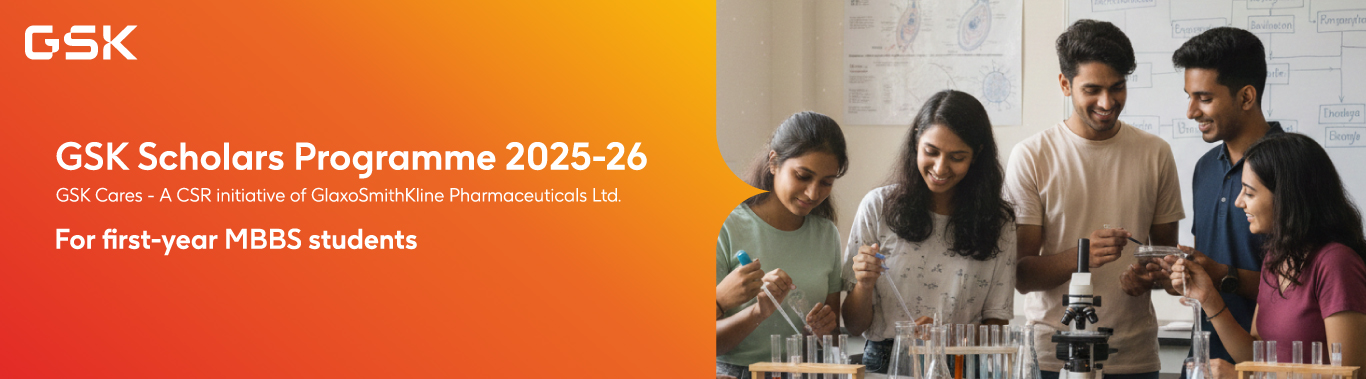 ಜಿಎಸ್ಕೆ ಸ್ಕಾಲರ್ಸ್ ಪ್ರೋಗ್ರಾಂ ಗ್ಲಾಕ್ಸೊ ಸ್ಮಿತ್ಕ್ಲೈನ್ ಫಾರ್ಮಾಸ್ಯುಟಿಕಲ್ಸ್ ಲಿಮಿಟೆಡ್ (GSK Programme) ನ ಅಡಿಯಲ್ಲಿ ಸರ್ಕಾರಿ ವೈದ್ಯಕೀಯ ಕಾಲೇಜುಗಳಲ್ಲಿ ದಾಖಲಾಗಿರುವ ಪ್ರಥಮ ವರ್ಷದ MBBS ವಿದ್ಯಾರ್ಥಿಗಳು 4.5 ವರ್ಷಗಳವರೆಗೆ ವರ್ಷಕ್ಕೆ 1 ಲಕ್ಷ ವಿದ್ಯಾರ್ಥಿವೇತನವನ್ನು ಪಡೆಯಲು ಅರ್ಜಿಯನ್ನು ಆಹ್ವಾನಿಸಲಾಗಿದೆ.